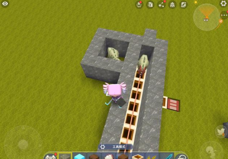 接着,玩家以留空第一格方块的那面为边,往外搭建出一个通道。该通道最好与养殖场呈九十度夹角,宽度为一格。搭建完成后,在通道的最头处分别放下巨人核心和红外线感应方块。