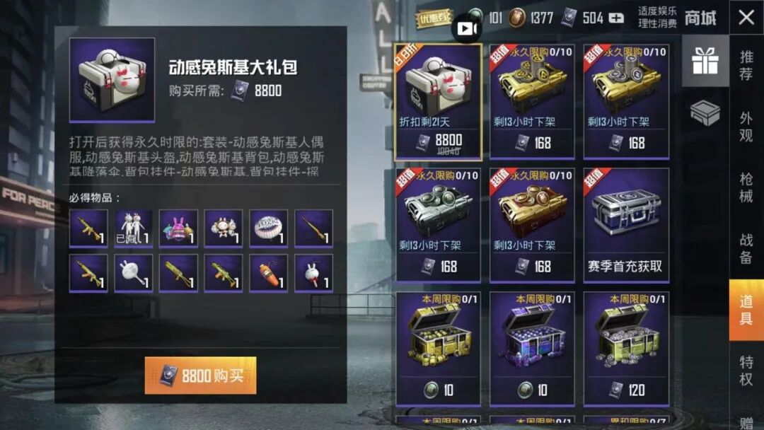 虽然光子并没有直接公布兔斯基的下线时间,但是可以从游戏商城里的“兔斯基大礼包”能看到,该礼包还有20多天的在线时间,所以按照这个时间来看,此时做任务并不晚哦~如果想要节省点券的话,小编觉得还是做一下任务比较合适一些。