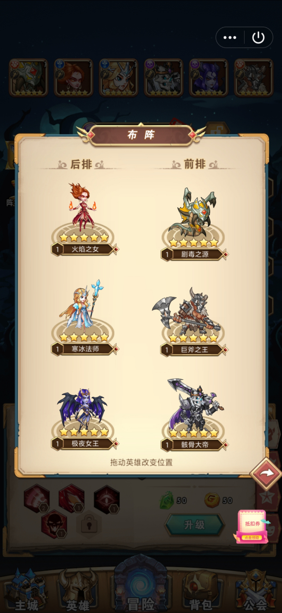 2、精英英雄的选择,前期可以培养的英雄比较多,巨斧之王(斧王)、岩石巨人(石头)、火焰之女(火女)、痛苦女王(女王)和骸骨大帝(大帝),小鹿的强力回血也是一个不错的选择,前期有两张石头的卡牌之后就可以着重培养石头,放弃斧王,但是到了中期精英英雄也就只有女王和大帝能用用了,特别是大帝升星到13星一直用到3kw战斗力都没问题,其他精英最后不要随意升到10星,不然要浪费一个英雄重生石去重生英雄。