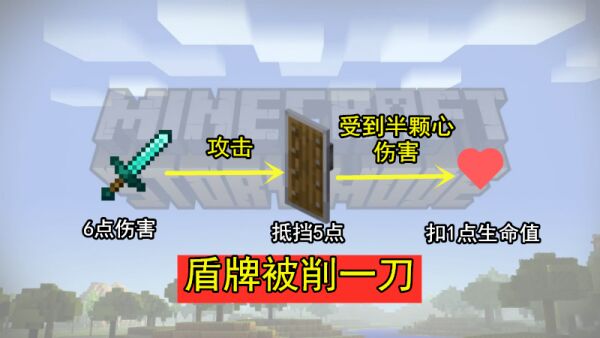 在战斗更新版本6的修改内容里,盾可谓是被mc官方大刀阔斧的一刀削了——最多只能抵挡5点伤害,就算玩家使用钻石剑等超出5点伤害值的武器,便能对持盾玩家造成1点溢出伤害(6钻石剑-5盾抵挡=1伤害值)。