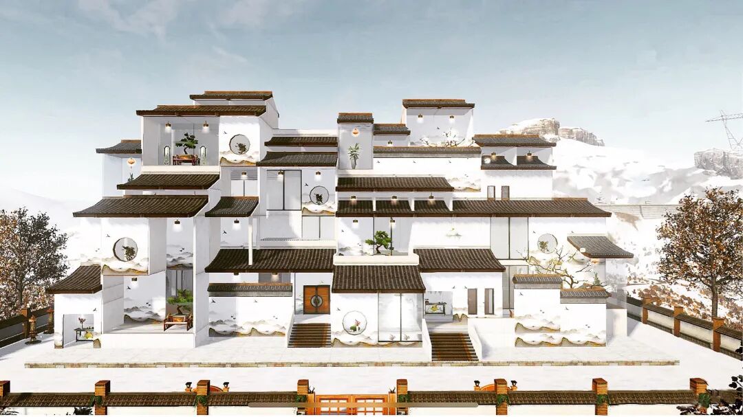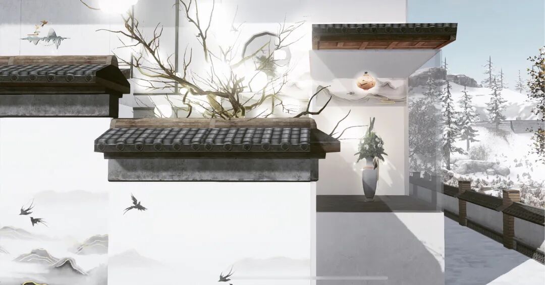 门外墙壁印画着山水墨画