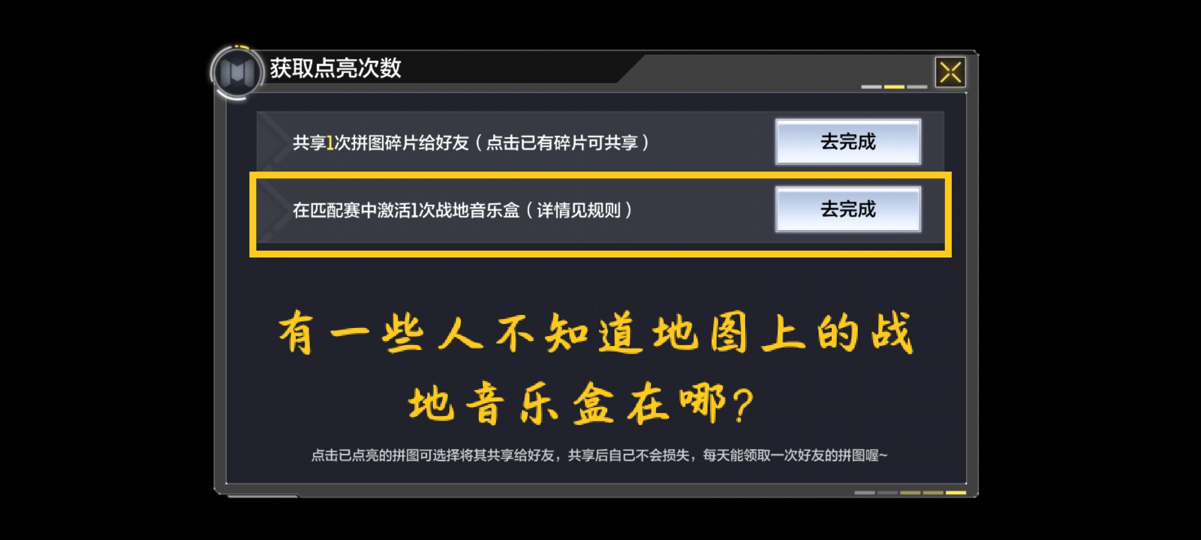 1.游戏里面想要完成战地音乐盒的任务,首先需要前往匹配赛的游戏模式当中,在匹配赛中激活音乐盒才可以完成任务