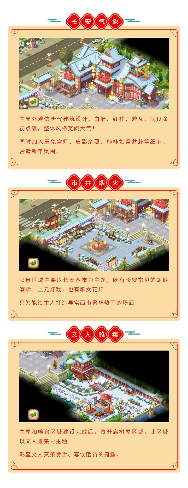 本次主题皮肤参考古代长安建筑和文化元素进行设计覆盖三个区域,主屋、喷泉和树屋