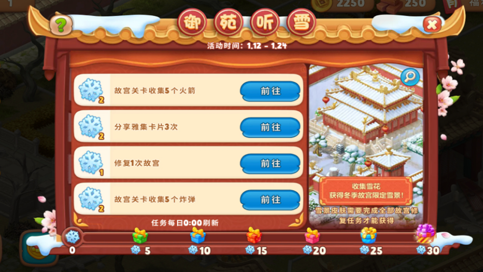 活动规则:完成御苑听雪任务,并修复故宫现有区域,即可获得御花园特殊限定皮肤——瑞雪丰年!