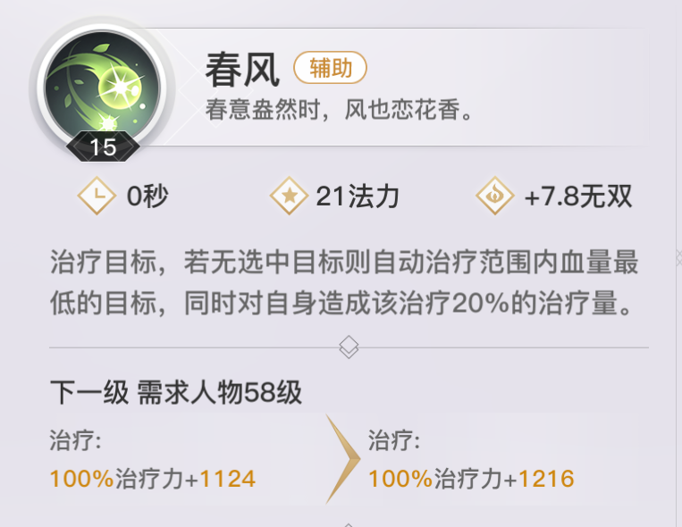 【春风】主要治疗技能 ,无cd技能,单体治疗。