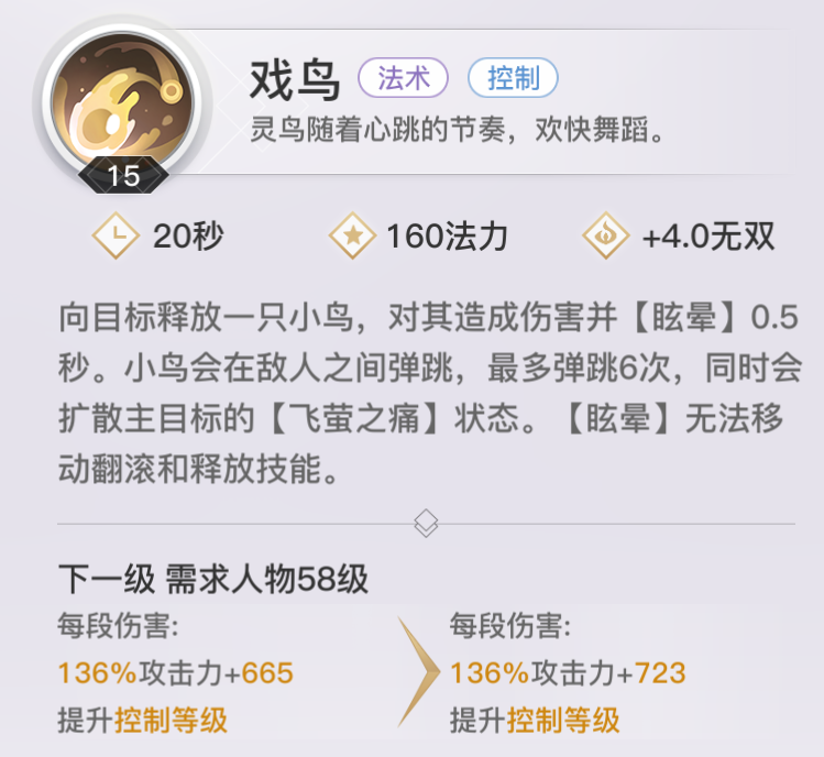 【戏鸟】主要控制技能,该技能可以在敌人之间进行最多6次弹跳,并会扩撒【飞萤之痛】。