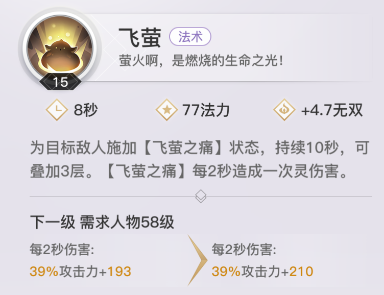 【千机】持续单体输出,有2段伤害,可回蓝,刷新【飞萤之痛】。
