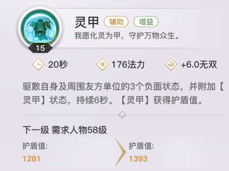 【灵甲】范围护盾技能,可驱散队友的debuff。