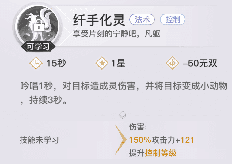 【纤手化灵】单体控制技能,需吟唱。