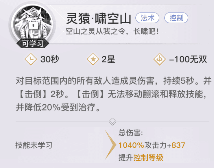 【灵猿·啸空山】范围法术伤害,范围击倒控制。