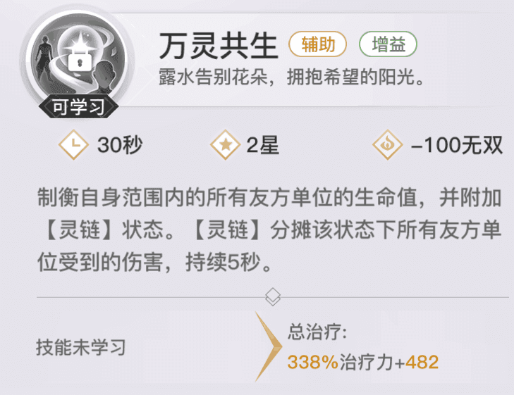 【万灵共生】分摊技,制衡所有友方生命值,分摊伤害。