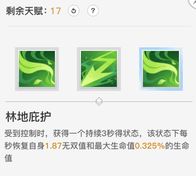 【林地庇护】受控时恢复生命和无双值。