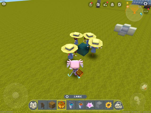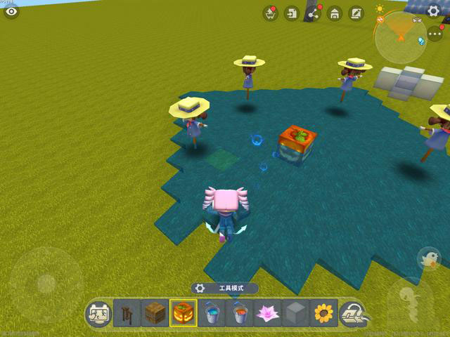 紧接着,玩家用草垛、木制栅栏、南瓜灯分别安装在刚刚那四个木制栅栏上,这样一来,水方块四周的木质栅栏就会变成为四个稻草人。等玩家用太阳花将稻草人吸引走后,就会发现刚刚放下的水方块还是处于被固定住的状态。