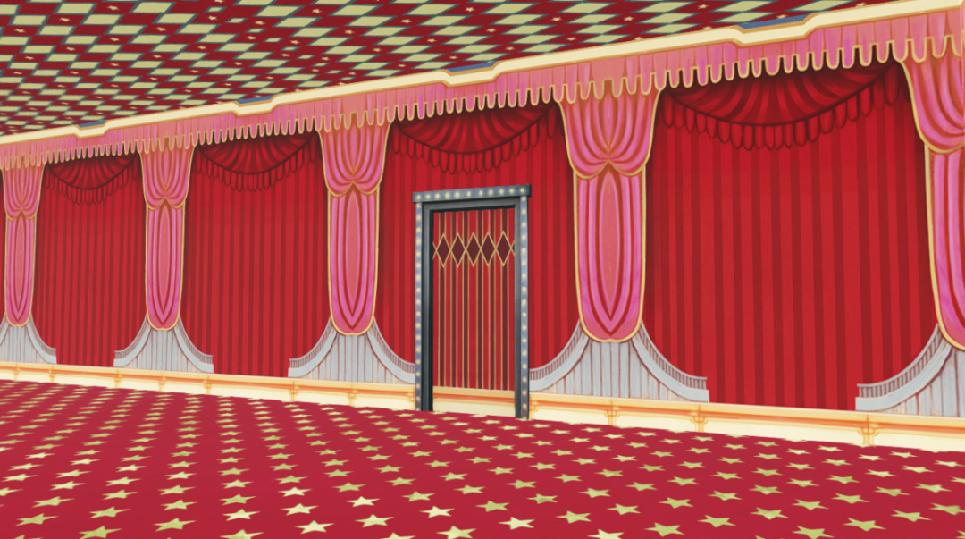 墙上拉开的幕布与装饰着灯球的门
