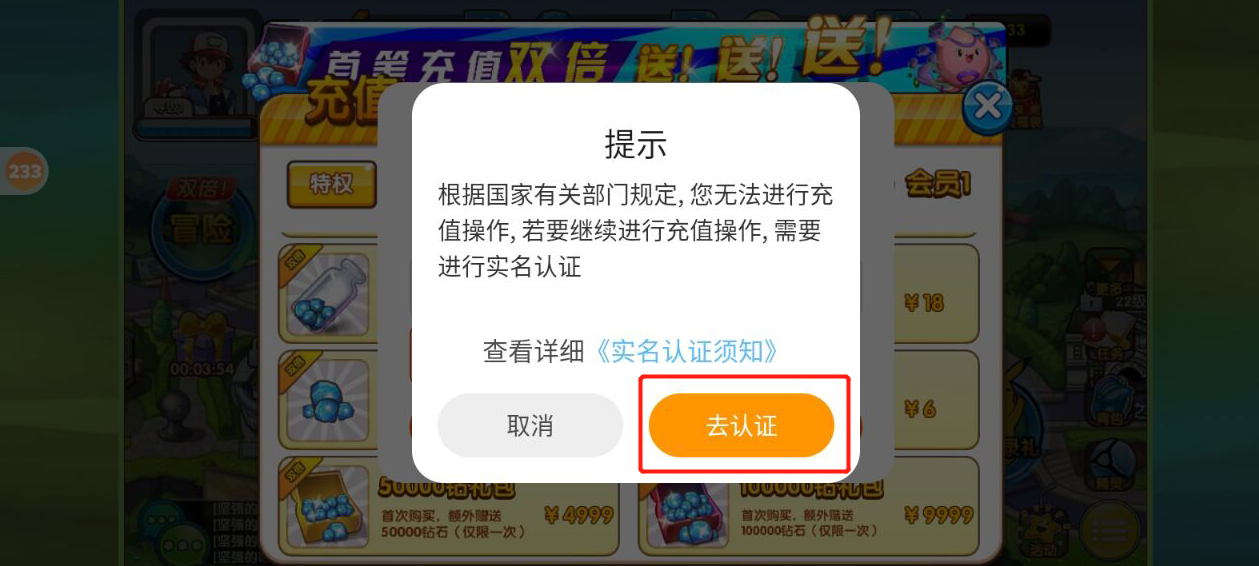4、未实名账号会自动弹出实名窗口,点击《去认证》
