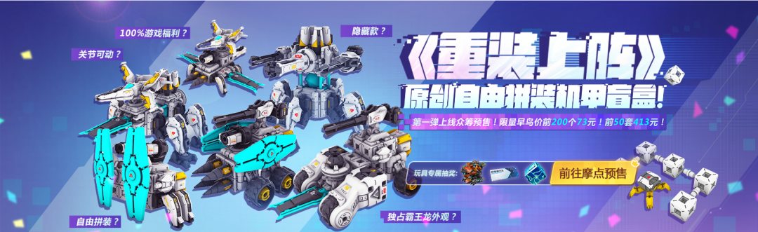 《重装上阵》自由拼装机甲系列盲盒第一弹预售启动!高度还原游戏造型,自由拼装组建专属战队!6款模块配备不一的盲盒,带来超越预设机型的搭配乐趣,更有隐藏款随机放送!