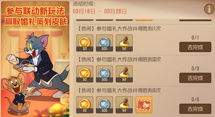 婚礼大作战即将开始,小伙伴们不要忘了加入到这样欢乐满满的玩法中来哦,我们可是为大家准备了不少好礼呢!金币、邮票、星星,就连上次影游联动期间大家所遗憾的汤姆·婚礼策划与杰瑞·婚礼策划皮肤只能二选一也能通过这次活动攒齐了哦~