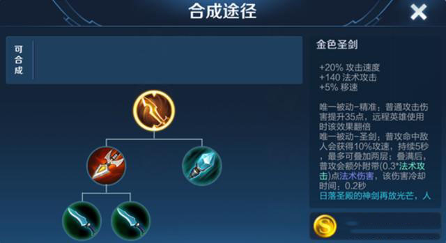 没错,金色圣剑这装备,最大的特点,那就是在出了之后,法师除了能够依靠自己的技能,普攻的伤害也是将会变得非常的不俗!金色圣剑的定价为2070,基础属性方面并不高,仅仅只有140点的法术攻击,以及20的攻击速度和5%的移速。但最为关键的,是金色圣剑的两大被动效果!