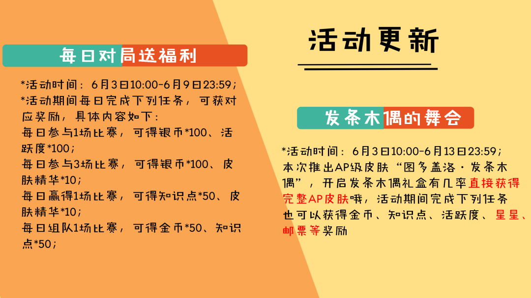 *“嘀嗒..嘀嗒..都跳起来吧~”本次推出AP级皮肤“图多盖洛·发条木偶”,开启发条木偶礼盒有几率直接获得完整AP皮肤哦,活动期间完成下列任务也可以获得金币、知识点、活跃度、星星、邮票等奖励,具体内容如下: