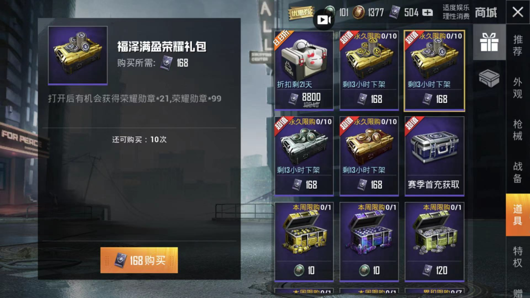 提醒下大家,如果准备挑战“新军需”珍藏宝箱的话,别忘了前往游戏商城里兑换“福泽满盈荣耀礼包”,168点券最少可以获得21个荣耀勋章,最多可以获得99个勋章,如果用1680点券直接拿下10个礼包的话,最少可以节省1000点券。如果运气不错的话,节省数千点券也是有可能。
