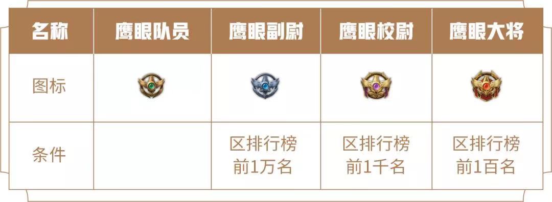 鹰眼大将:全区前100名玩家!权益:日喊话8次;周求助护卫队8次;日裁决32次。