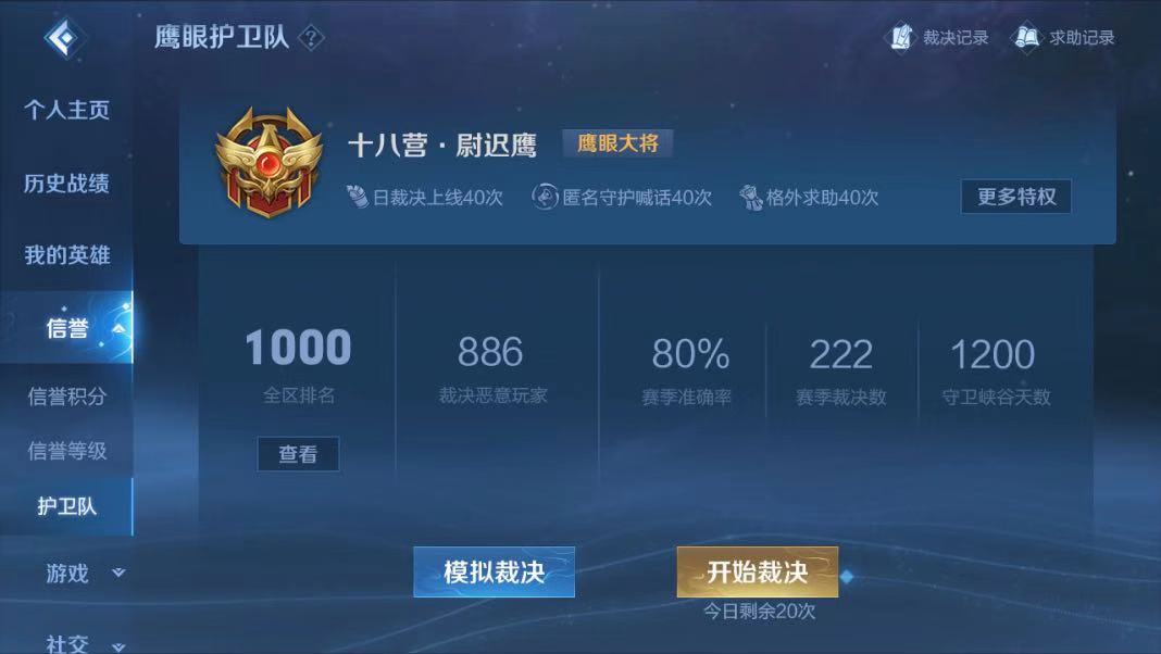 收到邀请函以后,玩家可以看到自己的信誉界面变成上图的样子,大家只要进行第二步的“模拟裁决”进行测试,测试通过以后【申请入队】的按钮就会亮起,这时候大家就可以真正成为一名“鹰眼护卫队”的成员了。