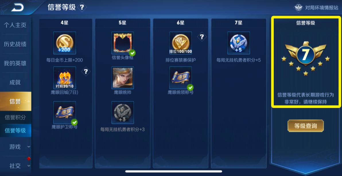 答:护卫队成员在游戏里是匿名的荣誉,但是在个人主页界面可是大有不同,从上图中可以看到,在原本显示信誉等级的地方,护卫队的成员会变成护卫队的等级。官方给了护卫队成员各种权益和荣誉,就是希望加入护卫队的成员能更好的维护好王者峡谷的游戏秩序。