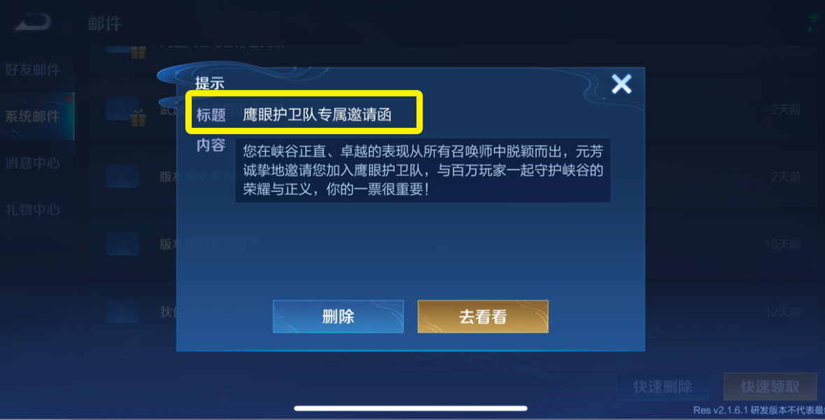 收到官方的邀请这只是第一步,因为玩家峡谷中4亿玩家中,信誉7级、信誉积分100的玩家有上千万,所以不可能所有达到这两个要求的玩家都能成为“鹰眼护卫队”的成员,人数太多反而会使举报机制失去原有的意义。(上图是体验服了官方给鸡哥发的邀请函)