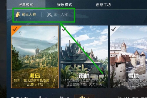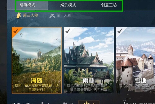 2、和平精英手游中,主要有游戏模式有三种,分别是经典模式、娱乐模式、创意工坊。