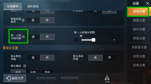 5、当然,如果在游戏中你不能查看到该按钮,则可以依次点击“设置”——“基础设置”——“功能设置”,打开第一人称切换功能的开关。