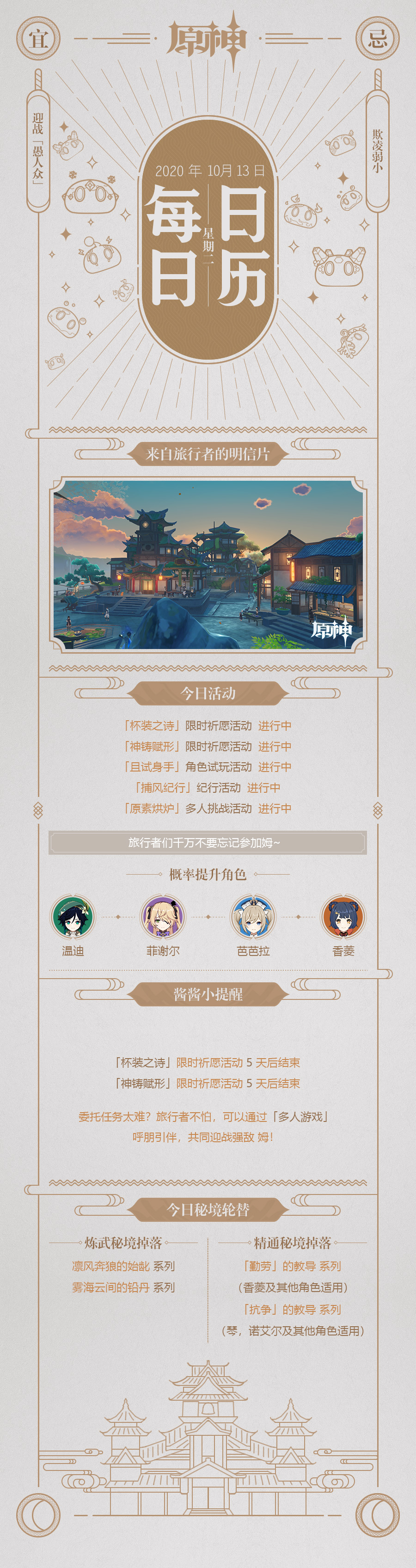 又是全新的一天,今天是10月13日,久等了旅行者,快来看看今天酱酱特意准备的指引~今天又是充满斗志的一天呢姆!⸜(* ॑꒳ ॑* )⸝