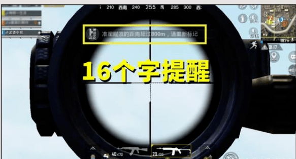 我们可以看到超越八倍镜八百米的距离以后,我们的上方有一段文字提醒,准星瞄准的距离超过800米,请重新标记!