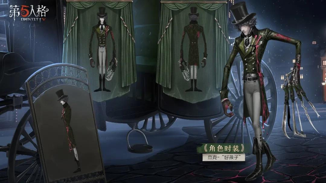 “杰克”-“好孩子”延续了帅气挺拔的风格,卷发、绿衣、领结、高礼帽,营造出了温文尔雅又谦逊温顺的气质,但当你把视线移到他左手的指刃时,不寒而栗的感觉瞬间便会将你惊醒,从左胸上的画笔处缓缓留下的红色颜料正不断向全身蔓延。