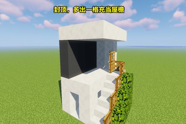 二楼墙壁搭建完成后对上方进行封顶,依旧选用平滑石英块。封顶的操作十分简单,但是一定要注意多出一格,和楼梯处于同一位置,这样既可以保证楼梯部分不会被雨淋到,也可以充当屋檐,增加美观。完成到这之后就只剩下最后的完善了。