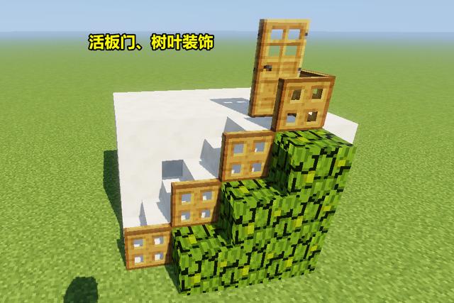 第一层搭建完毕之后就是装饰部分了。利用树叶对楼梯的侧面进行装饰,这也是为啥前面说到可填可不填的原因所在。树叶填充完后在楼梯侧面放置活板门,用来充当楼梯的扶手。虽然活板门看似没有作用,但在美观以及还原现实方面作用巨大,毕竟每一个建筑玩家都会以现实作为参照。
