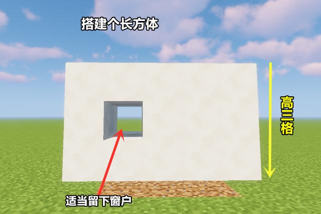 地基建造完毕之后就是对一层的填充了。按照刚才打的地基进行搭建,搭建成一个高为三米的长方体。除了当作门的位置留下两格空间,其余地方进行封闭。长方体的侧面可以挖掉一个方块充当窗户,增加美观以及内部光亮。