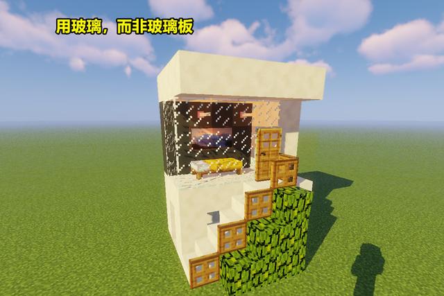 利用玻璃将二楼封闭起来,注意这里用的是玻璃而非玻璃板。最后在楼梯部分放上门,内部空间放上床、画以及末地烛装饰,一个简单温馨的庇护所就完成了。