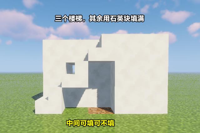 在长方体侧面搭建好三个楼梯,其余两格则用平滑石英块进行填充,以达到同一高度。楼梯下方的空白可填可不填,如果是在生存模式中建议不填,节省材料。当然如果你是强迫症玩家,那么还是填上吧。