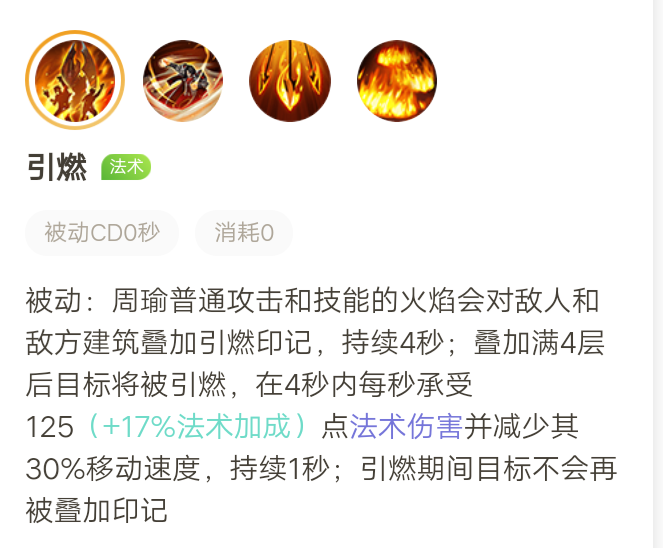 周瑜的被动是普通攻击和火区可以叠加印记,印记持续4秒,印记叠加4层后引燃目标并减少30%的移速,算是主要伤害来源