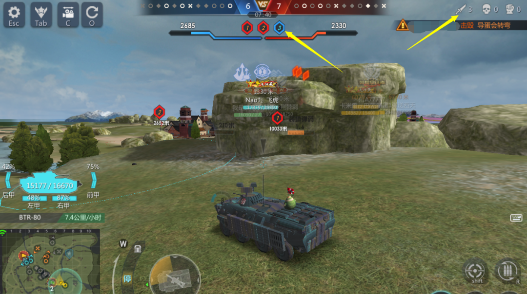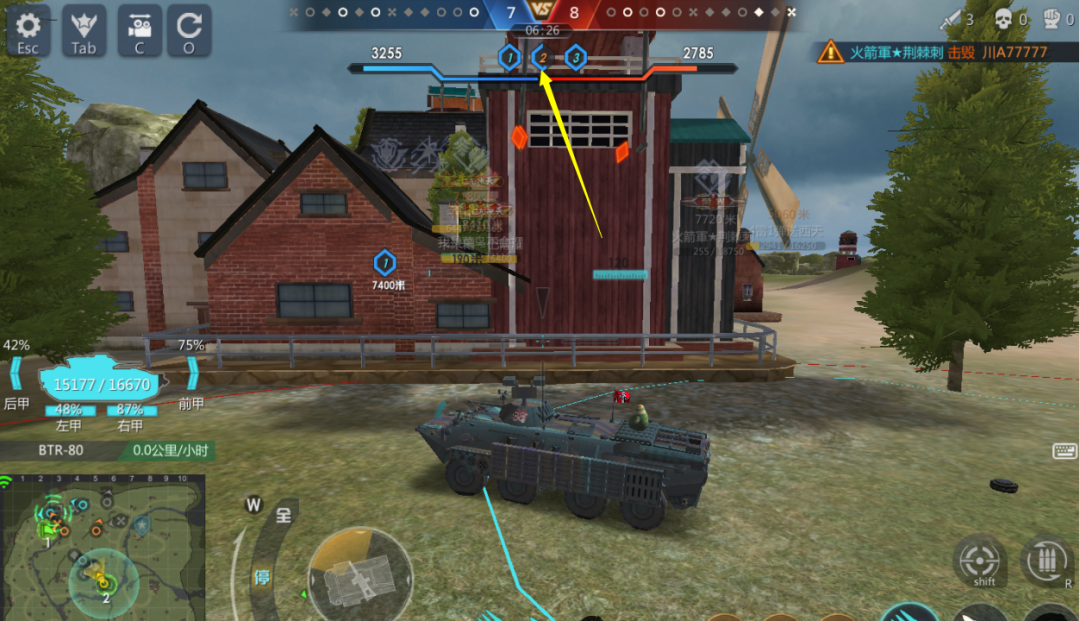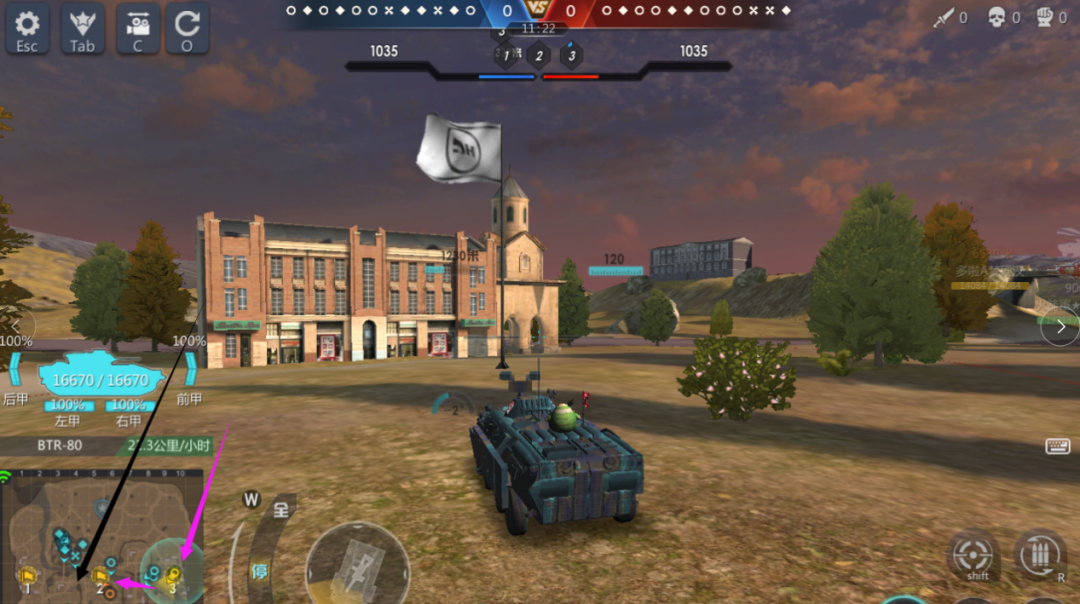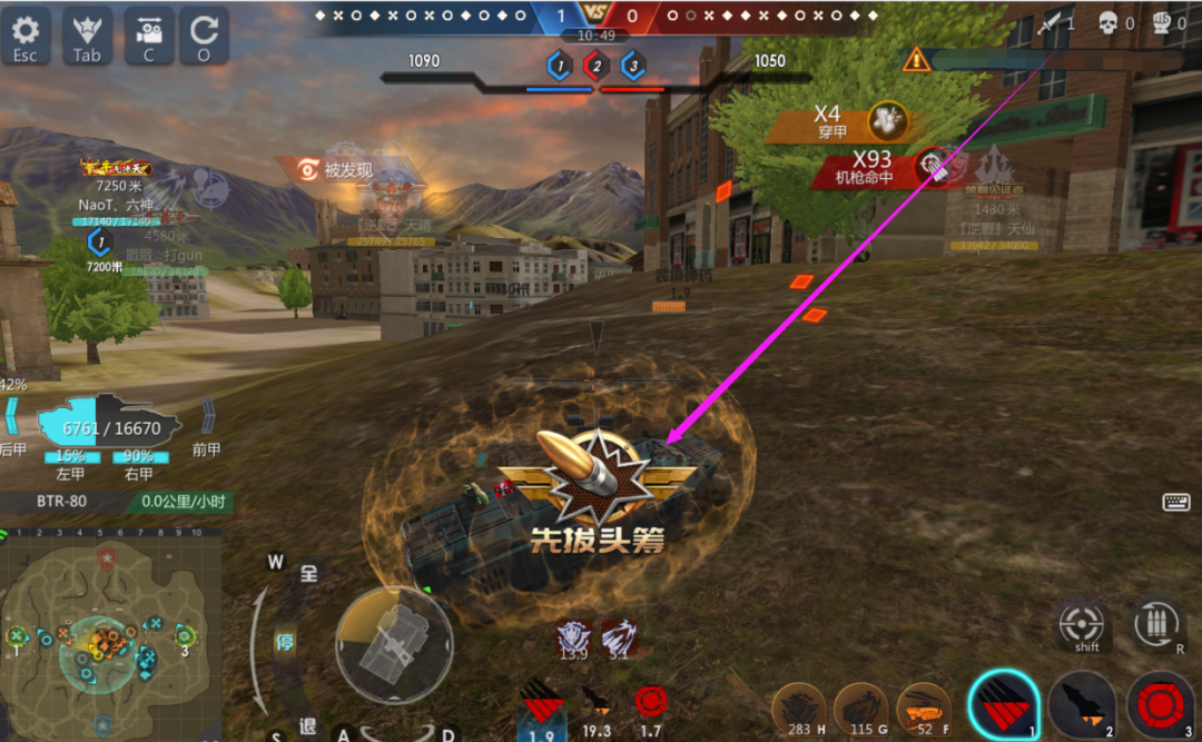 小编没有放弃,运气这局又好,有获胜的机会。所以运气是给有准备玩家提供帮助的。小编开局占领3点的同时击毁对方眼车,再走到2点高地收割2个残血装甲车,此时小编只消耗了1000多耐久(如果开局在3点单挑对方眼车的时候没有先打停对方就没有之后啦)