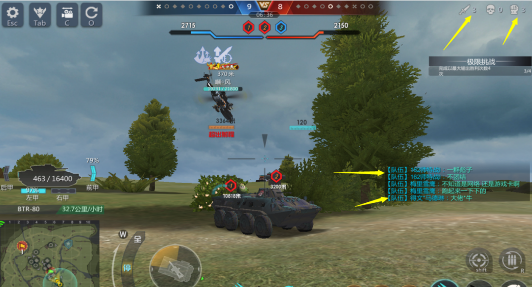这种开局的走位能赢吗?江湖传言说分散必输,哈哈哈。小编开局先拔头筹击毁对方眼车,普通玩家在这种对局中能做到不吃亏,不盲动,不白送就好。