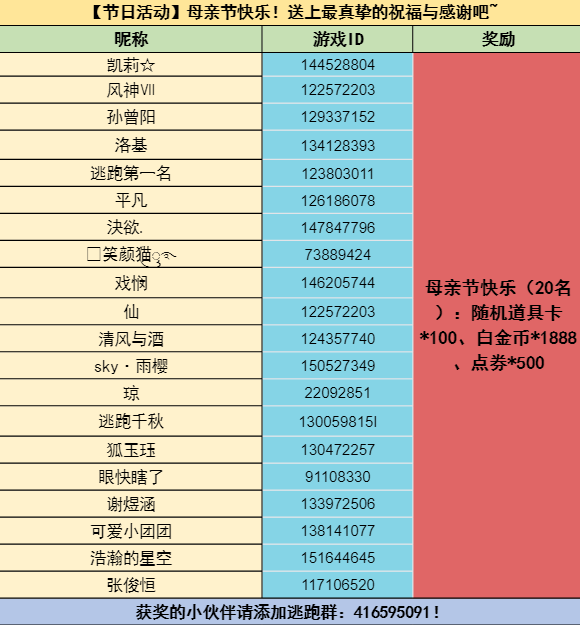 母亲节快乐(20名):随机道具卡*100、白金币*1888、点券*500