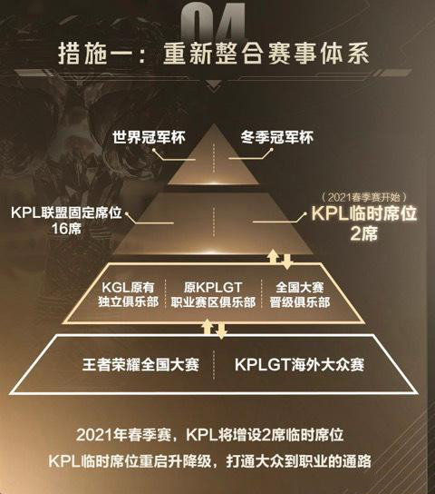 最最重要的也是最最关键的,就是KPL接下来的规划,在原有的16个队伍不变动的情况下将会增设两个临时席位,并且对于KGL的组成将会大规模的调整,将KPLGT和全国大赛晋级的俱乐部全部融入KGL当中,共同参与两个KPL临时席位的争夺,让大众体系的队伍也有机会登上职业赛场。