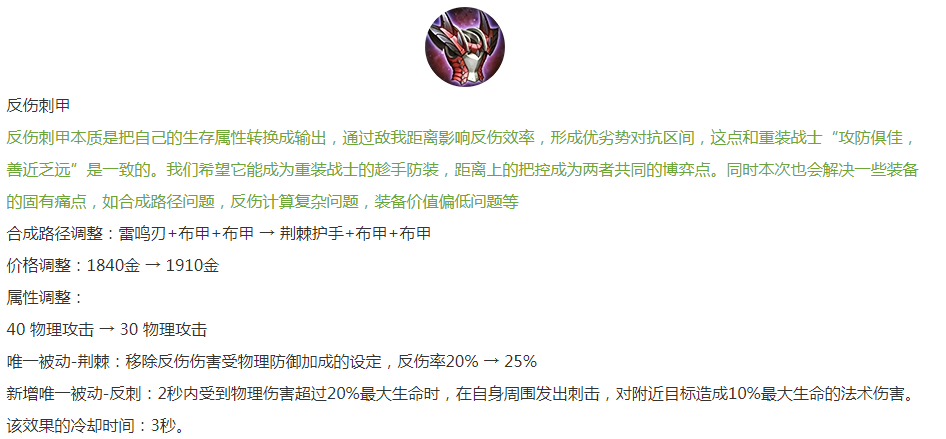 反伤刺甲加强:合成路径更平滑,反伤固定在25%,且新增一个被动,受到大量伤害时,会对周围造成百分比伤害。