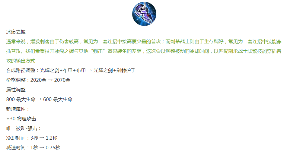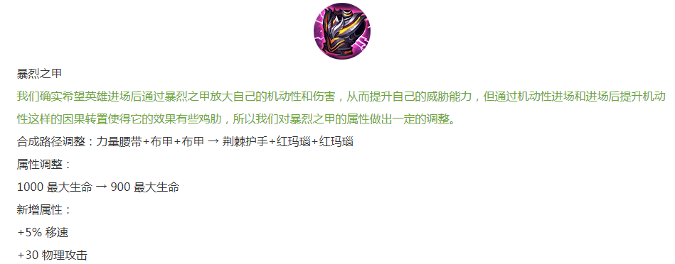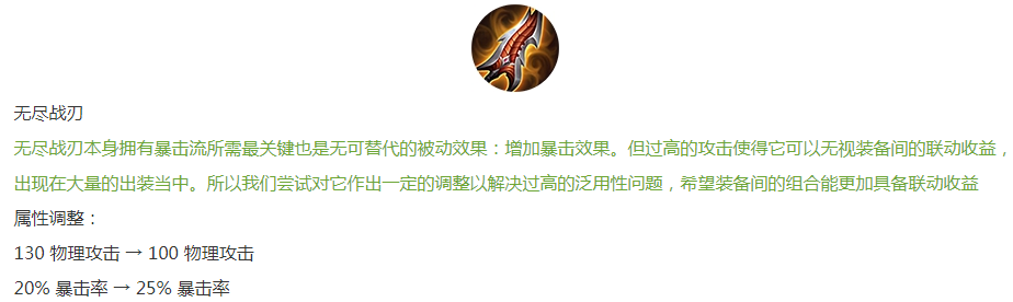 制裁之刃平调:重伤效果降低,移除吸血属性,新增血量与移速,攻击力增加20点。