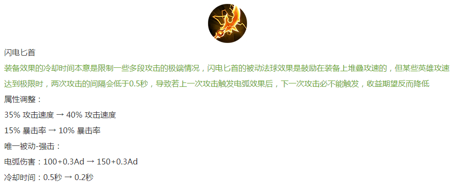 闪电匕首加强:暴击率降低,攻速增高,被动伤害大幅增高。