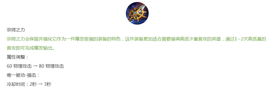 宗师之力削弱:攻击力增加20点,被动CD增长1秒,爆发伤害更高,持续输出更低。