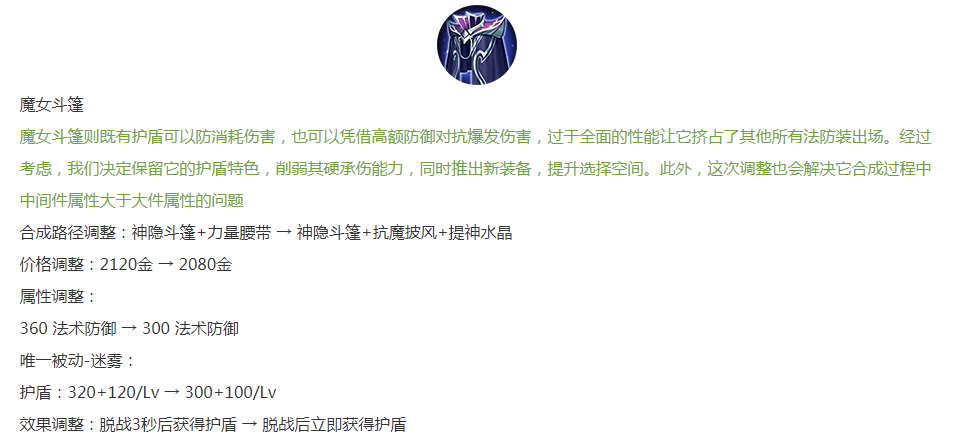 魔女斗篷削弱:防御力降低,护盾值降低,获得护盾的时间缩短。
