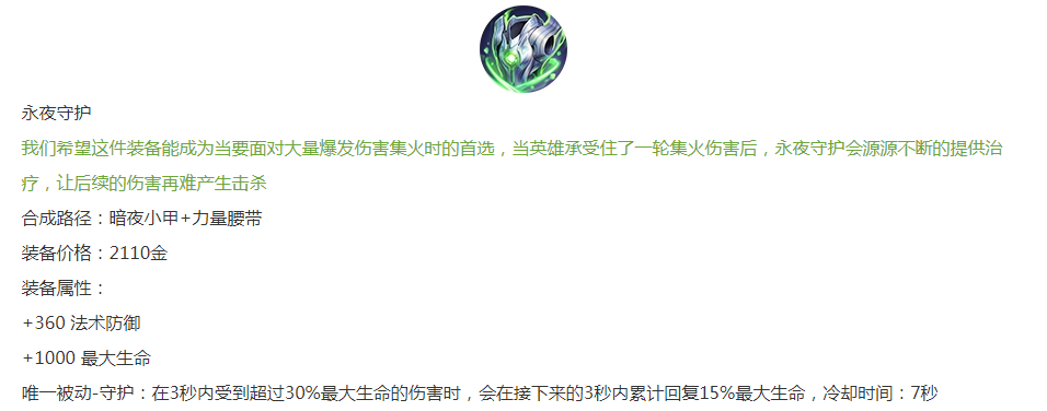 永夜守护:3秒内受到大量伤害会治疗自己,这装备非常适合白起和东皇太一,搭配不死鸟和其被动,那简直就是自带一个基地温泉。