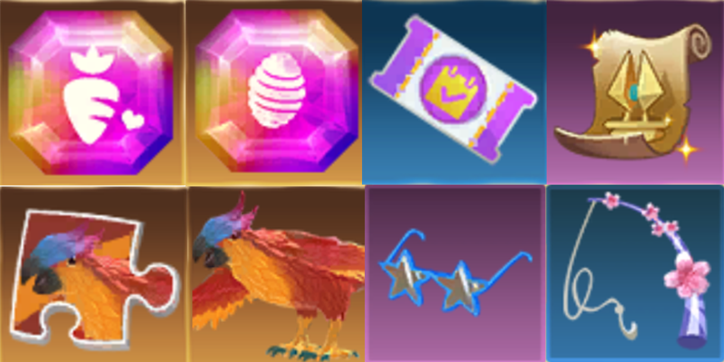 比如:疯疯兔进阶石、粉抱抱熊进阶石、传送卷轴、补签卡、小创君的宝贝的碎片、小创君的宝贝、星星眼镜、鱼竿-花藤
